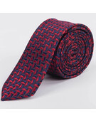 Аренда узкого галстука ярко-бордового цвета с насыщенно-синим треугольным узором для мужских костюмо